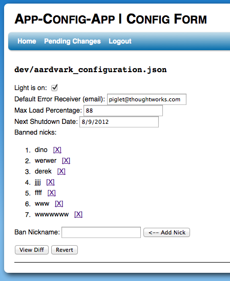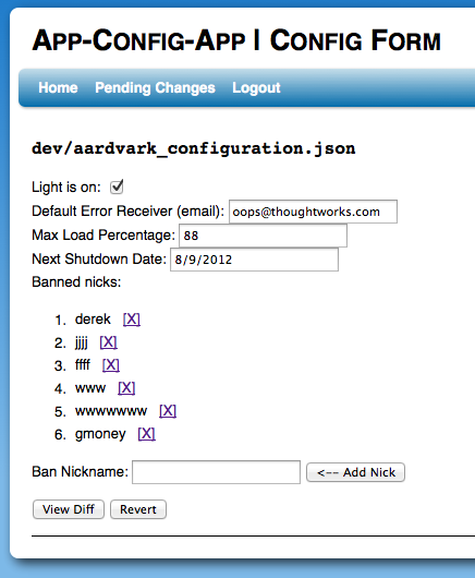 Changes to the form data are automatically saved. After making a view edits, you can click “View Diff” to get the diffs or “Revert” your changes. Go ahead and change the email address and fiddle around with the banned nicks, then go click “Pending Changes”:
